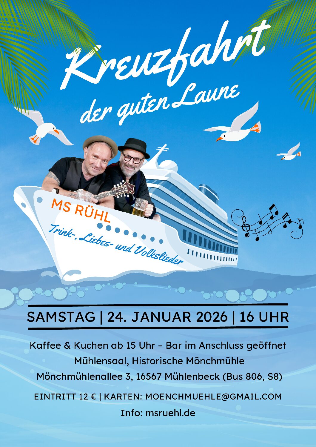 24. Januar 2026 @ 15:00 – 21:00 – MS RÜHL: Kreuzfahrt der guten Laune Der Kopf und der Kleene vom „Schauorchester Ungelenk“ haben sich wieder zusammengefunden. Zwar ohne Vogel auf der Brille, aber mit viel Spaß im Gepäck. Micha Seidel und Mario Rühl kennen sich seit 40 Jahren und haben gemeinsam über 3000 Live – Auftritte absolviert. Jetzt stehen und sitzen sie wieder […]